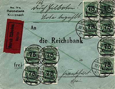 Inland cover with special delivery (1-20 g) from 23.09.1923 franked with 10 stamps a 75 000 Mark on 1 000 Mark (=750 000 Mark, 250 000 cover 500 000 special delivery) |