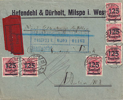 Inland cover with special delivery (1-20 g) from 28.09.1923 franked with 6 stamps a 125 000 Mark on 1 000 Mark (=750 000 Mark, 250 000 cover 500 000 special delivery) |