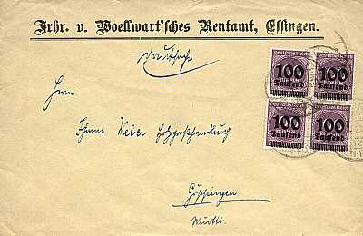 Inland printed matter (1-25 g) from 03.10.1923 franked with 4 stamps a 100 000 Mark on 100 Mark (=400 000 Mark) |