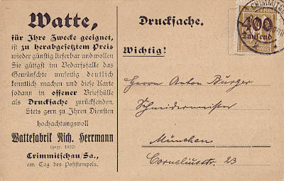 Inland printed matter (1-25 g) from 09.10.1923 franked with one stamp a 400 000 Mark on 25 Pfennig (=400 000 Mark) |