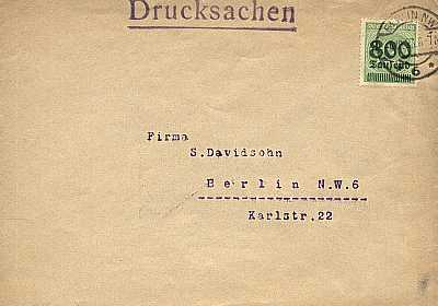 Inland printed matter (1-25 g) from 09.10.1923 franked with one stamp a 400 000 Mark on 40 Pfennig (=400 000 Mark) |