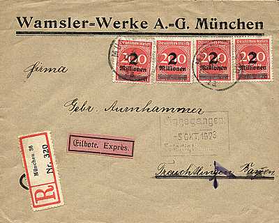 Inland cover with registeration and special delivery (1-20 g) from 04.10.1923 franked with 4 stamps a 2 Million Mark on 200 Mark (=8 Million Mark, 2 Million cover 2 Million registeration 4 Million special delivery)