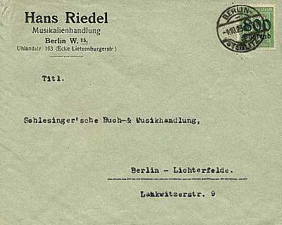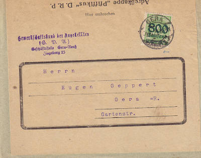 Local cover (1-20 g) from 06.10.1923 franked with one stamp a 800 000 Mark on 5 Pfennig (=800 000 Mark)