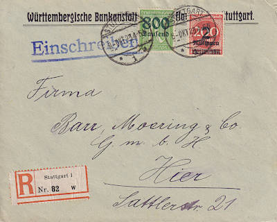 Local cover with registeration (1-20 g) from 06.10.1923 franked with 2 stamps(=2,8 Million Mark, 0,8 Million cover 2 Million registeration)