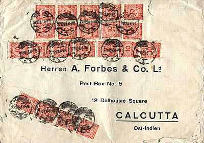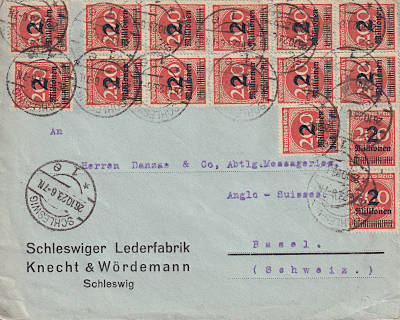 Auslandsbrief (1-20 g) vom 26.10.1923 frankiert mit 15 Marken a 2 Millionen Mark auf 200 Mark (=30 Millionen Mark) |