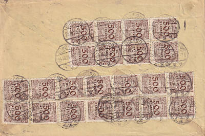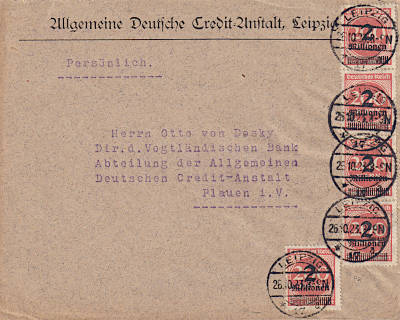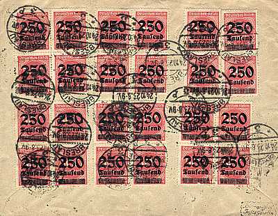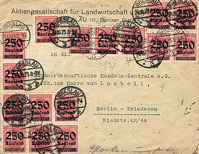Inlandsbrief (1-20 g) vom 25.10.1923 frankiert mit 5 Marken a 2 Millionen Mark auf 200 Mark (=10 Millionen Mark) |