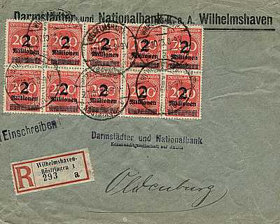 Inlandsbrief mit Einschreiben (1-20 g) vom 27.10.1923 frankiert mit 10 Marken a 2 Millionen Mark auf 200 Mark (=20 Millionen Mark, 10 Millionen Brief 10 Millionen Einschreiben) |