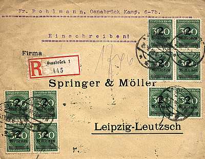 Inlandsbrief mit Einschreiben (1-20 g) vom 26.10.1923 frankiert mit 10 Marken a 2 Millionen Mark auf 300 Mark (=20 Millionen Mark, 10 Millionen Brief 10 Millionen Einschreiben) |