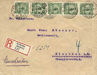 Inlandsbrief mit Einschreiben (1-20 g) vom 30.10.1923 frankiert mit 5 Marken a 4 Millionen Mark (=20 Millionen Mark, 10 Millionen Brief 10 Millionen Einschreiben) |