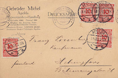 Auslandsdrucksache (1-50 g) vom 03.11.1923 frankiert mit 4 Marken a 10 Millionen Mark (=40 Millionen Mark)