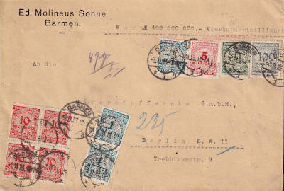 Inland cover with value (400 Million Mark) (47 g) from 03.11.1923 franked with 10 stamps (=198 Million Mark, 140 Million cover 50 Million registeration 8 Million value)