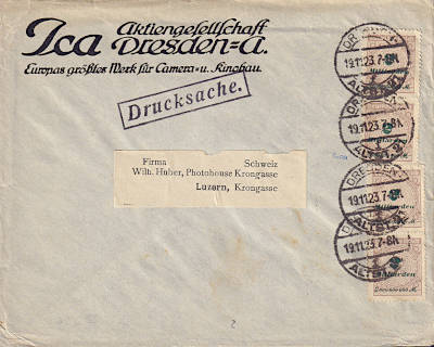 Foreign printed matter (51-100 g) from 13.11.1923 franked with 54 stamps (=16 Billion Mark)