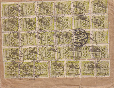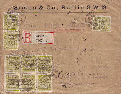 Inland cover with registeration (1-20 g) from 12.11.1923 franked with 40 stamps a 500 Million Mark (=20 Billion Mark, 10 Billion cover 10 Billion registeration)