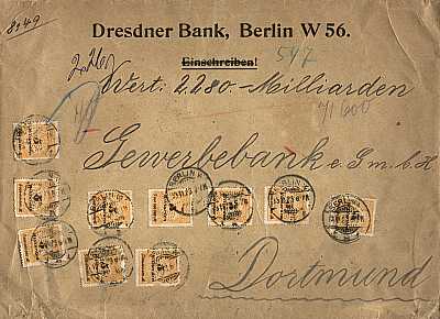 Inlandsbrief mit Wertangabe (2 280 Milliarden Mark) (226 g) vom 13.11.1923 frankiert mit 19 Marken (=71,6 Milliarden Mark, 16 Milliarden Brief 10 Milliarden Einschreiben 45,6 Milliarden Wert)