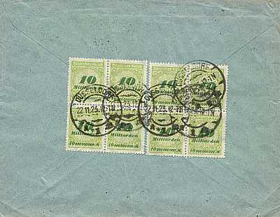 Auslandsbrief (1-20 g) vom 22.11.1923 frankiert mit 8 Marken a 10 Milliarden Mark(=80 Milliarden Mark)