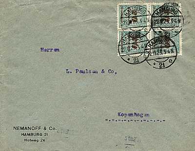 Auslandsbrief (1-20 g) vom 22.11.1923 frankiert mit 4 Marken a 20 Milliarden Mark (=80 Milliarden Mark)