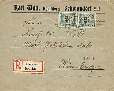 Inlandsbrief mit Einschreiben (1-20 g) vom 28.11.1923 frankiert mit 2 Marken a 20 Milliarden Mark (=160 Milliarden Mark, 80 Milliarden Brief 80 Milliarden Einschreiben)