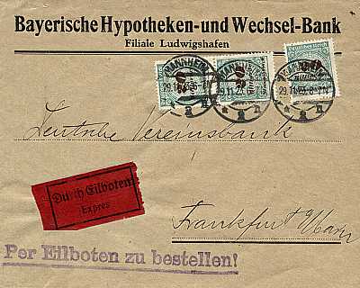 Inlandsbrief mit Eilzustellung (1-20 g) vom 29.11.1923 frankiert mit 3 Marken a 20 Milliarden Mark (=240 Milliarden Mark, 80 Milliarden Brief 160 Milliarden Eilzustellung) |