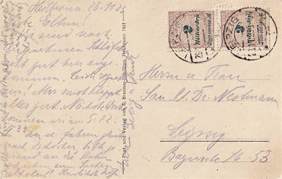 Local postcard from 29.11.1923 franked with 2 stamps a 2 Billion Mark (=16 Billion Mark)