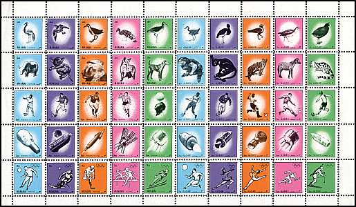 Bogen mit 25 Briefmarken von Ajman (rechts) und 25 Briefmarken von Manama (links)