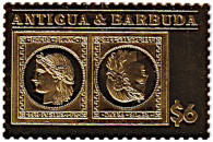 the same postage stamps on gold, silver or green metal foil |