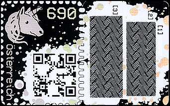 Kryptobriefmarke: Briefmarke mit einem digitalen Pedent in der Blockchain. Unter den Rubbelfeldern bedinden sich die Zugangs-daten zu einer digitalen Geldbörse |