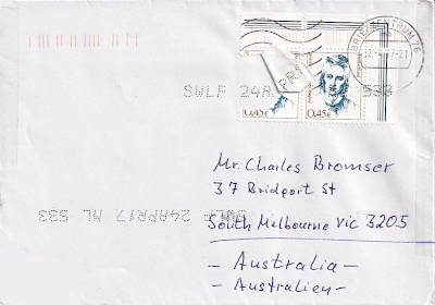 Auslandsbrief frankiert mit 2 Briefmarken in unterschiedlicher Qualität |