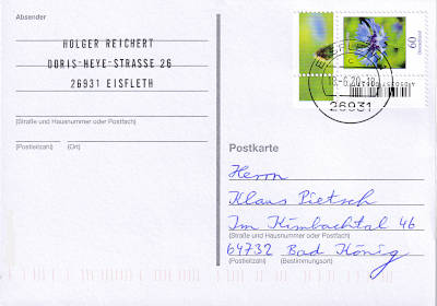 Inlandspostkarte frankiert mit 2 Briefmarken mit oder ohne Unterdruck |