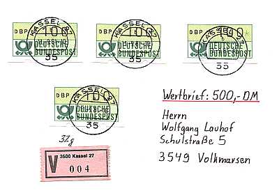 Automatenbriefmarkenwertstufenmisch-frankatur: Postsendung frankiert mit mehr-eren unterschiedlichen Automatenbriefmar-ken einer Ausgabe |