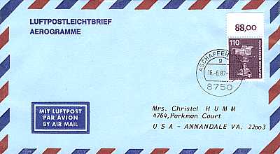 Hinweisvermerk Aerogramme: Vermerk der auf eine Sonderleistung für einen Aus-landsbrief mit Luftpost hinweist bestehend aus einem Briefumschlag oder Faltbrief aus dünnem Papier der nicht mehr als 5 Gramm wiegt (Luftpostleichtbrief) |