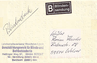 Hinweisvermerk Blindensendung: Ver-merk der auf eine gebührenfreie Grundsend-ung hinweist die ausschliesslich in Blinden-schrift verfasstes Schriftgut oder Tonträger enthalten darf |