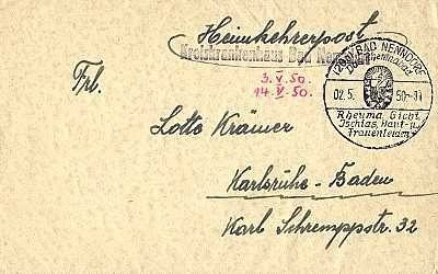 Hinweisvermerk Heimkehrerpost: Ver-merk der auf eine gebührenfreie Postsend-ung für heimkehrende Soldaten hinweist die aufgrund ihrer Verwundung oder Erkrankung noch nicht entlassen werden konnten |