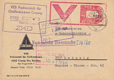 Hinweisvermerk Rohrpost: Vermerk der auf eine Sonderleistung hinweist bei der die Beförderung auf Wunsch des Absenders in einer Büchse durch Rohrleitungen mittels Druck- oder Saugluft (in Deutschland ab 01.08.1927 Zusatzleistung) |