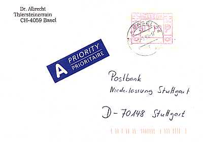 Hinweisvermerk Priority: Vermerk auf einer Postsendung die von der Post bevorzugt befördert werden sollte |