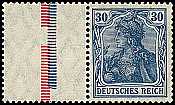 gezähnter Briefmarkenbilddruck mit Zierfeld ohne Trennungshilfe zwischen den Bogenfelder: Zweierstreifen Bilddruck mit Zierfeld mit Zähnung die als beabsicht-igte Ausführung zwischen den Bogenfelder mit keiner Trennungshilfe versehen wurde |