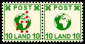 falscher Zusammendruck mit entfernter Zähnung zwischen den Briefmarken: zwei einzelne echte Briefmarken bei denen in betrügerischer Absicht die Zähnung teilweise abgeschnitten wurde um sie dann miteinander zu verbinden |