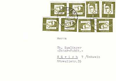 Inlandsbrief (21-50 g) vom 12.03.1964 (3. Periode) frankiert mit 8 Marken a 5 Pfennig (=40 Pfennig) |