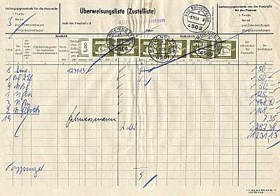 Überweisungsliste vom 08.11.1963 (3. Periode) frankiert mit 6 Marken a 5 Pfennig (=30 Pfennig) |