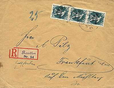 Inlandsbrief mit Einschreiben (21-100 g) vom 24.08.1921 (6. Periode) frankiert mit 3 Marken a 60 Pfennig (=1,80 Mark, 0,80 Brief1 Einschreiben)