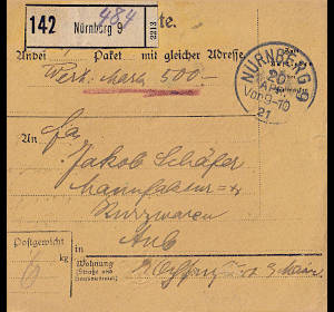 Inlandspaketkarte (7 500 g, > 75 km) vom 12.10.1920 (5. Periode) frankiert mit einer Marke a 4 Mark (=4 Mark)