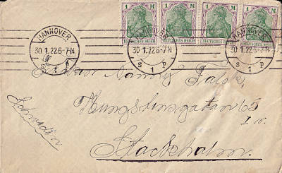 Auslandsbrief (1-20 g) vom 30.01.1922 (7. Periode) frankiert mit 4 Marken a 1 Mark(=4 Mark)