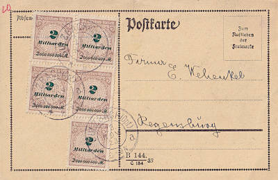 Inlandspostkarte vom 23.11.1923 (25. Periode) frankiert mit 5 Marken a 2 Milliarden Mark (=10 Milliarden Mark) |