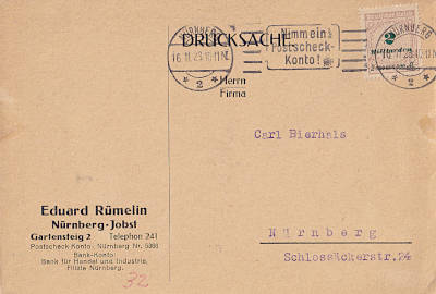 Inlandsdrucksache (1-25 g) vom 16.11.1923 (24. Periode) frankiert mit einer Marke a 2 Milliarden Mark (=2 Milliarden Mark) |