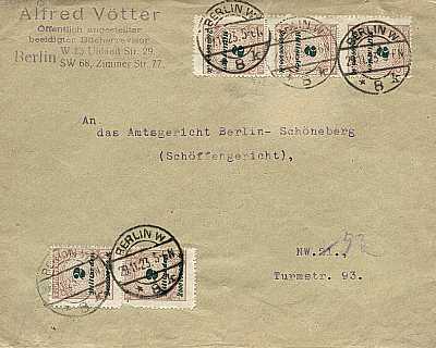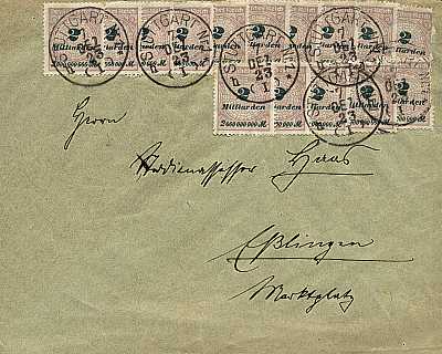 Inlandsbrief (1-20 g) vom 14.11.1923 (24. Periode) frankiert mit 5 Marken a 2 Milliarden Mark (=10 Milliarden Mark) |
