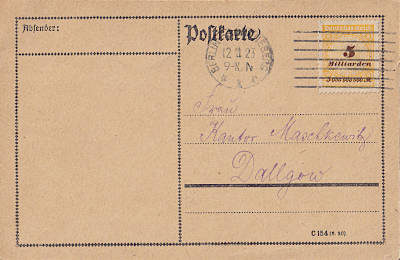 Inlandspostkarte vom 23.11.1923 (25. Periode) frankiert mit 2 Marken a 5 Milliarden Mark (=10 Milliarden Mark) |