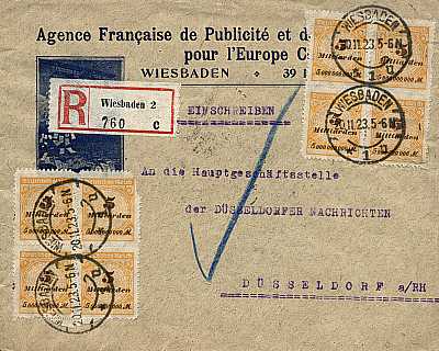 Inlandsbrief mit Einschreiben (1-20 g) vom 20.11.1923 (25. Periode) frankiert mit 8 Marken a 5 Milliarden Mark (=40 Milliarden Mark, 20 Milliarden Brief 20 Milliarden Einschreiben) |