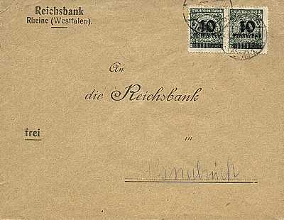 Inlandsbrief (1-20 g) vom 20.11.1923 (25. Periode) frankiert mit 2 Marken a 10 Milliarden Mark auf 50 Millionen Mark (=20 Milliarden Mark) |