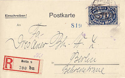 Local postcard with registeration from 28.01.1923 (12. Period) franked with one stamp a 50 Mark (=50 Mark, 10 postcard 40 registeration) |