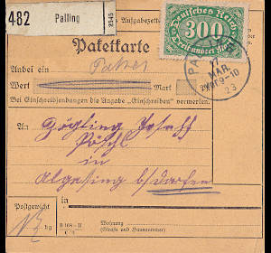 Inlandspaketkarte (1 000 g, < 75 km) vom 17.03.1923 (13. Periode) frankiert mit einer Marke a 300 Mark (=300 Mark) |