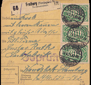 Inlandspaketkarte (8 000 g, > 75 km) vom 19.01.1923 (12. Periode) frankiert mit 3 Marken a 300 Mark (=900 Mark) |